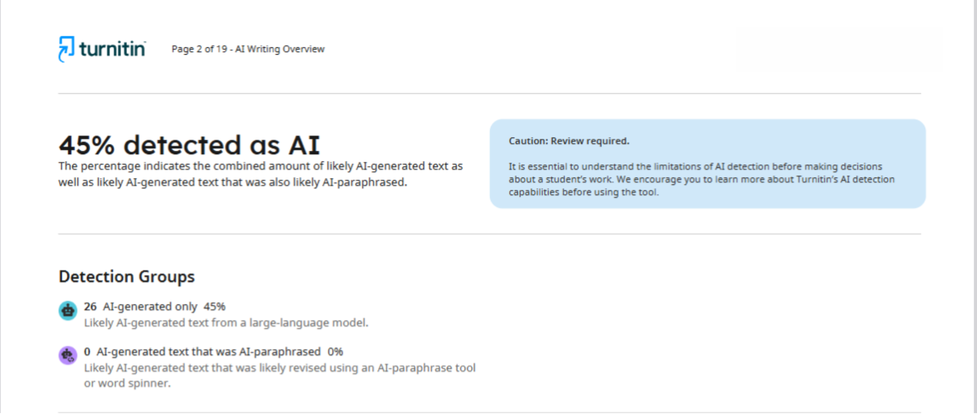 Например, в этом случае для анализа одной статьи было использовано два разных детектора: Turnitin и Pangram. В отчете, предоставленном первой платформой, указано, что текст на 45% сгенерирован искусственным интеллектом.